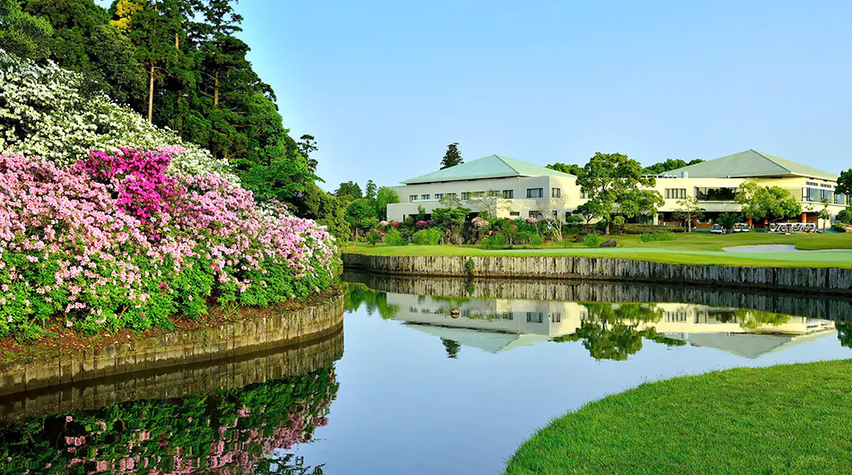 眼下には青く鮮やかな南国の海、日向灘が広がり、高低差40mのフラットな丘陵コースには3つの池がたくみにレイアウトされ、美しい自然と溶け込んでいます。